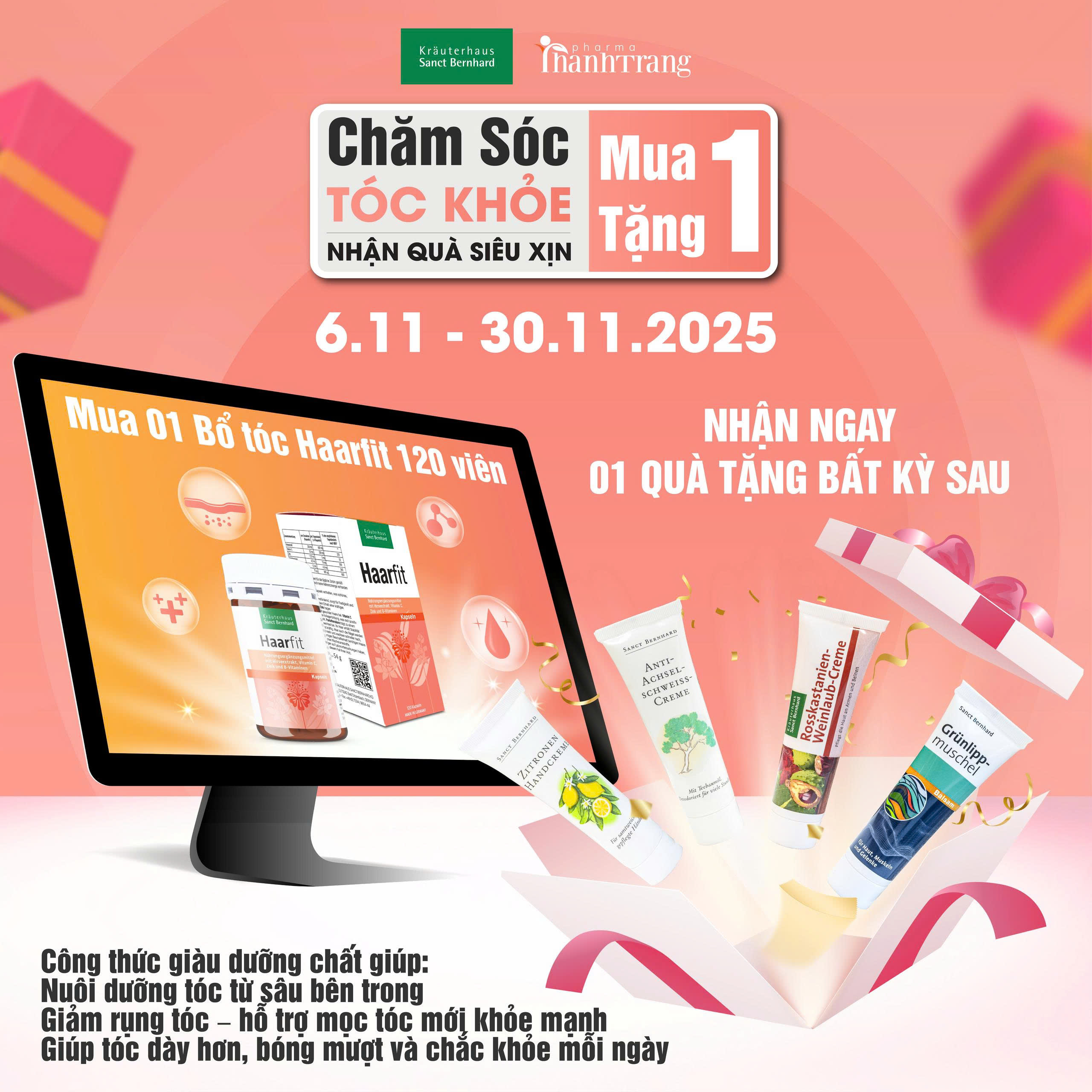 Từ 06/09/2025 – 31/12/2025, khi mua 05 sản phẩm chính hãng trong nhóm 07 sản phẩm Sanct Bernhard tại các nhà thuốc/quầy thuốc đối tác của Thanh Trang Pharma, bạn sẽ được tặng ngay 01 sản phẩm như sau: