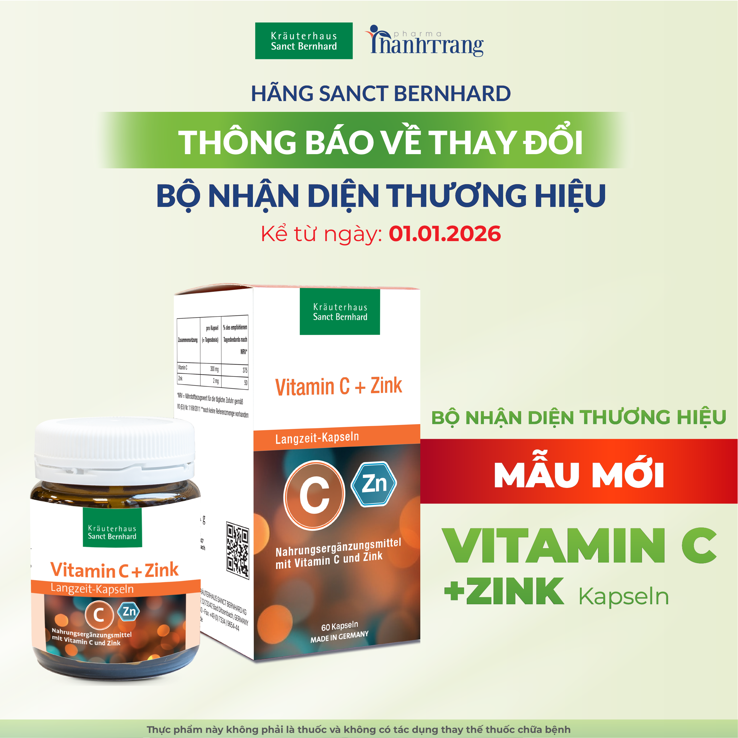 Nhằm mang đến trải nghiệm đồng nhất và chuyên nghiệp hơn cho người tiêu dùng toàn cầu, đồng thời nhận được yêu cầu từ hãng Sanct Bernhard KG – CHLB Đức, Công ty TNHH XNK Dược Mỹ phẩm Thanh Trang chính thức thông thay đổi bộ nhận diện thương hiệu mới cho tất cả sản phẩm Vitamin C Zink có SĐK 2512/2018/ĐKSP do Cục An toàn thực phẩm – Bộ Y tế cấp ngày 11 tháng 05 năm 2018..
